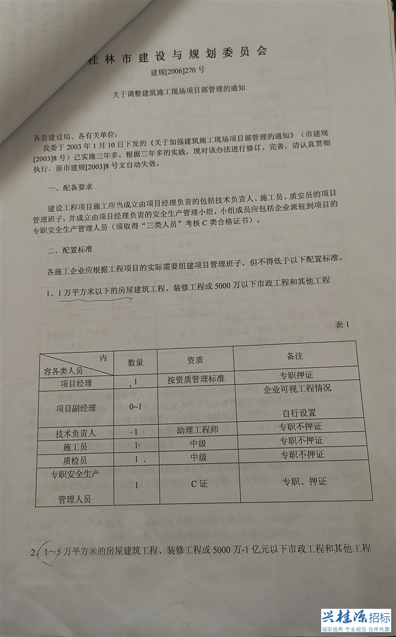 3、桂林建設與規劃委員會(huì )建規【2006】270號《關(guān)于調整建筑施工現場(chǎng)項目部管理的通知》詳見(jiàn)公告附件1。